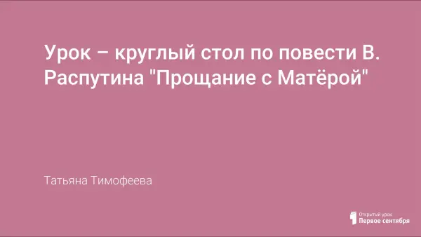 Урок проходит в форме беседы вокруг круглого стола, где обсуждаются вопросы сохранения человеческих ценностей прошлого, вопросы сохранения природных богатств на примере произведения В.Распутина. Учащиеся отвечают на вопросы, зачитывают наиболее значимые для них фрагменты из повести, комментируют их, высказывая свою точку зрения; учатся разбираться в психологии личности, устанавливать причинно-следственные связи.