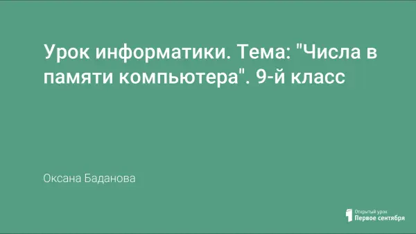 На уроке учащиеся знакомятся с представлением положительных и отрицательных числах в памяти компьютера, о разрядности ячейки памяти и диапазоне значений чисел, вещественных чисел в памяти компьютера; особенностями работы с целыми, вещественными числами.