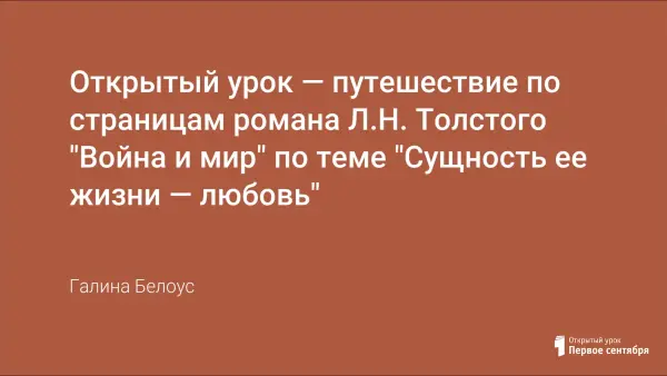 Цель урока: провести синтез и углубление знаний об образе главной героини романа Л.Толстого "Война и мир", продолжить обучение навыкам лингвостилистического анализа текста; воспитывать любовь к Родине, стремление жить, не боясь трудностей и ошибок, учить любить жизнь во всех ее проявлениях.