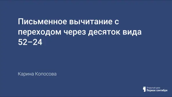 Целью данного урока является познакомить с приемом вычитания вида 52–24; совершенствовать навыки устного счета и умение решать составные задачи; развивать мышление и смекалку.