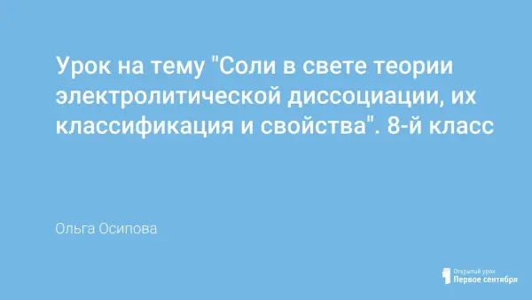 Цели урока: сформировать понятие о солях как классе электролитов; классифицировать соли по составу кислотного остатка и по растворимости в воде; изучить общие химические свойства солей в свете теории электролитической диссоциации.