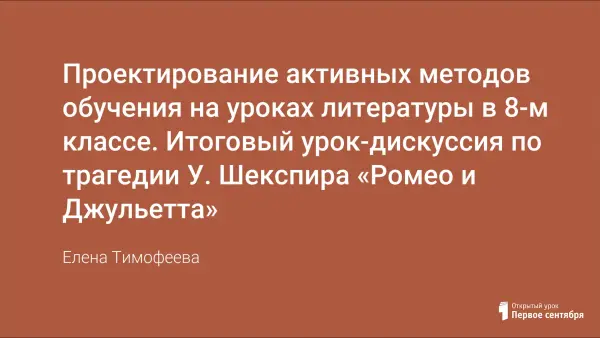 Тема дискуссии: Герои трагедии У. Шекспира «Ромео и Джульетта». Характеры, сюжетная роль, отношение автора. Дискуссия предполагает использование групповой работы. При проведении дискуссии использовалась методика работы в малых группах (с распределением организационных ролей в группе), а также следующие формы дискуссий: «дискуссия по переписке», разговор по кругу, использование карточек-сигналов.