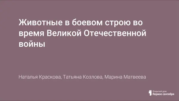 Цель мероприятия: показать особую значимость отношений животных и человека в военное время способствовать воспитанию чувства патриотизма, гордости за свою страну, соотечественников, на примере наших прадедов, храбрости и мужества всего народа. Задачи: познакомиться с «профессиями» животных на войне; почувствовать сострадание и ответственность по отношению к «братьям нашим меньшим»; активизировать работу по поиску материалов о «службе» животных на войне и в тылу.