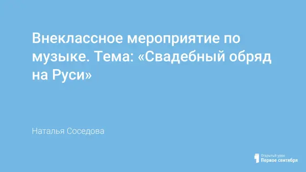 Чтобы полнее и ярче представить свадебный обряд на Руси, для учащихся 6–7-х классов разработано внеклассное мероприятие по музыке в виде театрального сценария. Цель мероприятия: познакомить учащихся с обрядом старинной русской свадьбы. В сценарии представлен фрагмент русской свадьбы - утро свадебного дня. Что же происходило в это время в доме невесты и жениха?