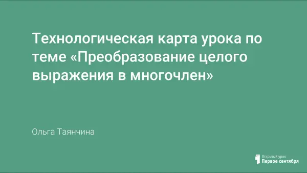 Цели урока: систематизация знаний обучающихся по теме «Преобразование целого выражения в многочлен», обобщение наиболее важных понятий, закрепление навыков и умений преобразовывать целые выражения; закрепление навыков решения различных заданий; развитие умения слушать и слышать, вступать в диалог, самостоятельности и мышления ребенка средствами своего предмета.