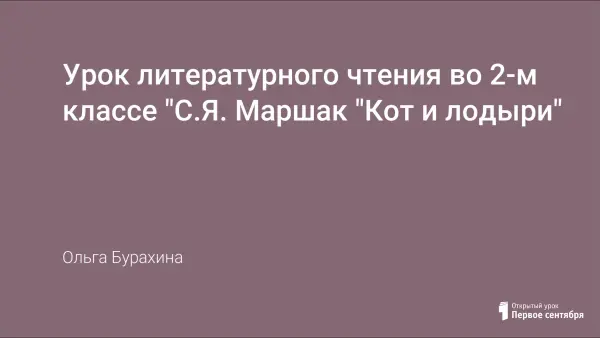Цели урока: познакомить детей с некоторыми моментами жизни и творчества С.Я. Маршака, его стихотворением "Кот и лодыри"; развивать навык чтения, творческие способности, внимание учащихся; формировать у детей устойчивый интерес к чтению.