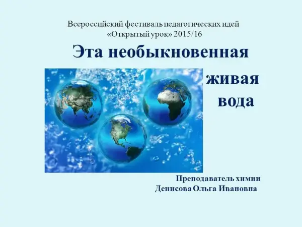 Задачи урока: узнать всё о воде, а именно: её физические и химические свойства, зачем она нужна, и как её сберечь. Придумать свои экологические способы, показывающие, как можно сберечь воду, чтобы планета Земля всегда была райским уголком в нашей Вселенной. На основе полученных знаний сформировать навыки экологической культуры, а также чувство прекрасного, бережного отношения к воде.