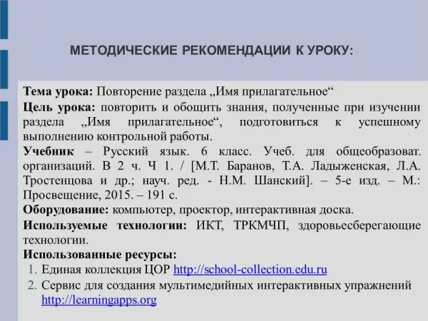 Данная разработка представляет повторительно-обобщающий урок в 6-м классе в соответствии с ФГОС. Урок реализует использование системно-деятельностного подхода в обучении, который обеспечивает формирование УУД. Использование ЦОР и ЭОР позволяет повторить и обобщить знания, полученные при изучении темы «Имя прилагательное» в игровой форме, подготовиться к успешному выполнению контрольной работы.