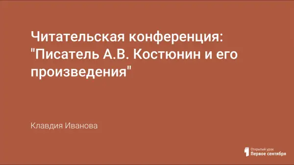 Читательская конференция позволяет развивать способность самостоятельно анализировать прочитанное, формировать у детей навыки публичных выступлений, пропагандировать лучшие произведения разных видов и жанров, на богатом материале рассказов Костюнина воспитывать в учениках чувства гуманности, справедливости, активной жизненной позиции, сопричастности всему происходящему.