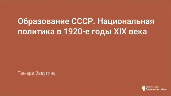 Цель урока: раскрыть альтернативные варианты создания национального государства; создать условия для формирования у учащихся понимания значимости выбора федеративной формы устройства при образовании СССР как для нашей страны, так и для мирового исторического процесса в целом; сформировать представление о политике коренизации; продолжить формирование навыков работы с текстом исторического источника, картой, выполнения логических операций анализа, сравнения, обобщения, оперирования понятиями, монологической устной формы речи.