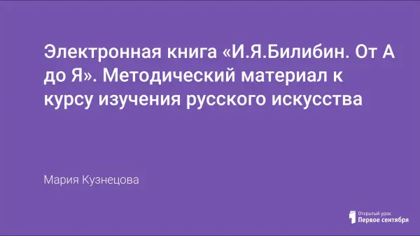 Методический материал посвящен творчеству Ивана Яковлевича Билибина. В энциклопедической литературе можно прочитать, что И.Я.Билибин - русский художник: график, книжный иллюстратор и театральный оформитель; активный участник объединения «Мир искусства»; создатель уникального «билибинского» стиля. Эта информация говорит о широте его творчества, но не передает его пленительной силы. Мы чаще всего знакомимся с работами Билибина еще в детстве, читая сказки, оформленные художником. Нас впечатляют их красочность, узорочье, внимание к деталям. Работы Билибина полны очарования и остаются в памяти надолго. Материал представлен в виде электронной книги «И.Я.Билибин. От А до Я», построенной по принципу азбуки. Почему книги? Потому что Билибин – это, в первую очередь, художник книги, вся творческая энергия мастера была направлена на создание книги как уникального произведения искусства.