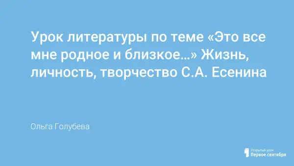 Цель урока: познакомить учащихся с биографией С. Есенина; раскрыть духовный мир поэта, круг его увлечений и интересов; показать, как развивался поэтический талант С.Есенина, кто оказал на него влияние. Урок будет эффективен как в 5-м классе, так и в 11-м классе, но только как вводный урок по биографии и творчеству Сергея Александровича Есенина.