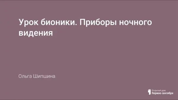Бионика – прикладная наука о применении в технических устройствах и системах принципов, свойств, функций и структур живой природы. Данный урок «Приборы ночного видения» позволяет более подробно рассмотреть применение «патентов природы». Это позволяет вовлечь студентов в дискуссию, научить их выражать и обосновывать свое мнение, вызывает интерес студентов к научным опытам и позволяет вовлечь их в познавательную деятельность.
