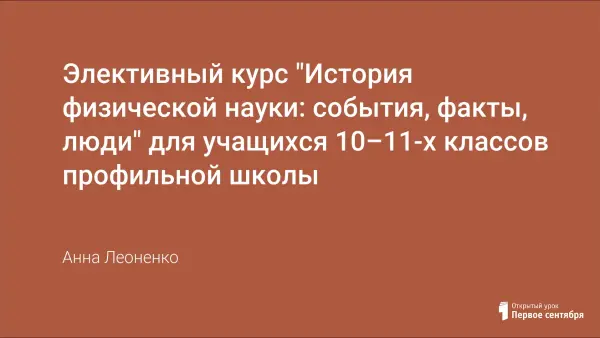 Элективный курс "История физической науки: события, факты, люди" - это один из возможных путей реализации интеграции содержания школьного образования в современных условиях в связи с переходом к профильному образованию. Его можно использовать для классов естественнонаучного и физико-математического профилей как обобщающий курс, и как курс, направленный на углубление и расширение знаний по физике, интеграцию с курсом истории для классов гуманитарного и социально-экономических профилей.