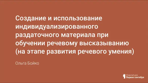 Индивидуализированный раздаточный материал рассмотрен как новое средство реализации индивидуализированного обучения основным типам речевого высказывания на этапе развития речевого умения; описана структура ИРМ; выявлены условия эффективной организации процесса обучения речевому высказыванию в зависимости от индивидуальных особенностей учащихся; разработана технология работы с ИРМ при индивидуализированном обучении иностранному языку в цикле уроков, а также факультативных занятиях, при самостоятельной работе дома.
