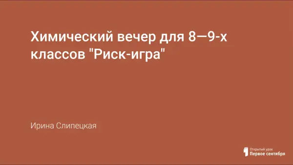 Внеклассная работа по химии - важное звено учебно-воспитательной работы в школе. Её содержание должно быть связано с изучаемым курсом химии, а формы проведения соответствовать возрасту учащихся, их желаниям и интересам. В нашей школе традиционным стало проведение недели химии. Наибольший интерес вызывают у ребят проведение интеллектуальных игр в форме соревнования команд. Предлагаю на фестиваль разработку химического вечера "Риск - игра".