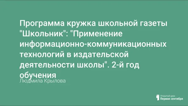 Неотъемлемой частью жизни ЛСШ № 1 является продукция школьного издательства - газета "Школьник", издаваемая силами учеников под руководством учителя. За время существования газеты было создано уже около 50 выпусков. К началу учебного года возникают трудности с календарно-тематическим планированием из-за отсутствия типовой программы для ДО. Поэтому я разработала программу, знакомящую учащихся с современным издательским процессом. Программа предназначена для первого года обучения.