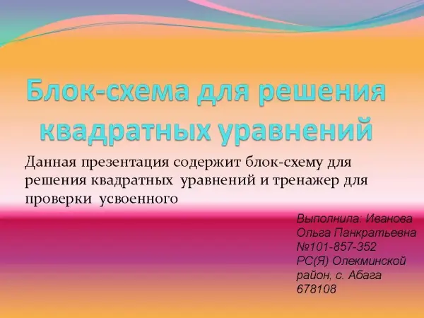 Презентация содержит блок-схему для решения квадратных уравнений и тренажер для проверки усвоенного.