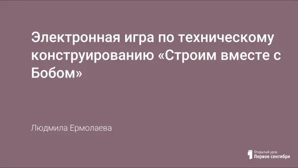 В методической разработке представлена электронная игра по техническому конструированию для детей старшего дошкольного возраста. Задача игры: реализовать парциальную программу «От Фребеля до робота» посредством участия дошкольников в электронной игре «Строим вместе с Бобом»; развивать способность видеть конструкцию предмета и анализировать его основные части, устанавливать функциональное назначение каждой из них, местоположение этих частей; привлекать детей к практической деятельности создавая из деталей конструктора разнообразные здания и постройки.
