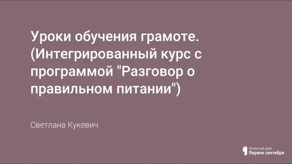 Представлены конспекты интегрированных уроков обучения грамоте и программы "Разговор о правильном питании". Тематика уроков близка детям. Поскольку интеграция - это не самоцель, а определенная система в деятельности учителя, то должен быть отдельный результат интегрированного обучения. Результаты работы в рамках интегрированного курса позволили: повысить уровень знаний по предмету, изменить уровень интеллектуальной, познавательной деятельности учащихся; эмоционально развить учащихся, основываясь на привлечении музыки, живописи, лепки, литературы.