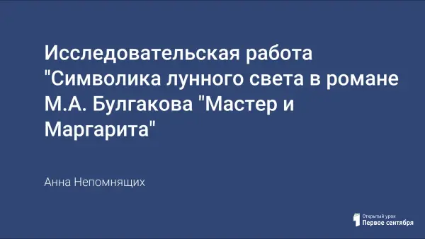 Вашему вниманию предоставляется исследовательская работа по литературе "Символика лунного света в романе М.А. Булгакова "Мастер и Маргарита", в которой можно найти ответы на многие вопросы.