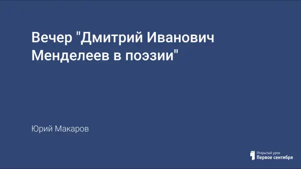 В работе представлен конспект внеклассного мероприятия к 175-летию со дня рождения Д.И. Менделеева. Материал основан на самостоятельной поисковой работе учащихся с использованием справочного материала, сборников стихотворений клинских поэтов, встреч с местными поэтами и сотрудниками музея-усадьбы Д.И. Менделеева "Боблово". В работе рассмотрены лишь некоторые стихотворения о Д.Менделееве, чтобы каждый слушатель захотел взять книги и прочитать о нем, почувствовать себя современником великого ученого, его коллегой, учеником, другом, товарищем, земляком.