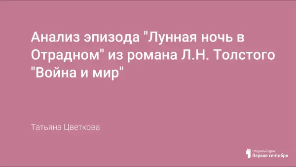 Анализ эпизода "Лунная ночь в Отрадном" из романа Л.Н. Толстого "Война и мир" помогает ученикам понять внутренний мир Наташи Ростовой и Андрея Болконского, проследить зарождение симпатии и интереса между этими героями.