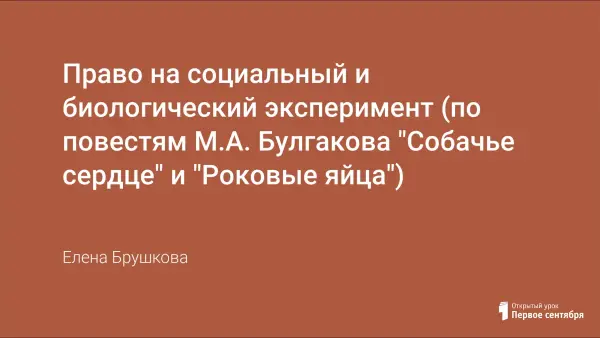 Содержание урока – продолжение разговора об индивидуальном писательском подходе к изображению действительности. Преемственность в использовании основных булгаковских приемов в произведениях разных жанров: тема операции–эксперимента, учителя–ученика и др.
