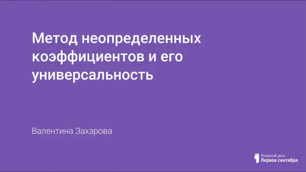 Автором подобраны и рассмотрены восемь видов заданий, при выполнении которых применяется метод неопределённых коэффициентов. Рассмотренные в работе примеры могут быть решены и другими способами. Но цель работы заключалась в том, чтобы показать универсальность этого метода, его оригинальность и рациональность, не отрицая того, что в некоторых случаях он приводит к громоздким, но несложным преобразованиям.