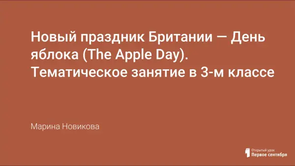 Целью тематического занятия стало познакомить учеников с новой традицией Великобритании – Днем яблока. Дети разучивали и исполняли стихи и песни о яблоках на английском языке, готовили доклады, сценку. В данном занятии широко задействован междисциплинарный аспект – изготовление поделок, обобщение знаний о природе. Урок позволил развить речевую и языковую, а также социокультурную компетенцию. Занятие позволило расширить кругозор, актуализировать знания, создать положительную мотивацию.