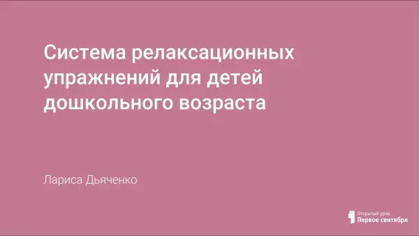 Система релаксационных упражнений для детей дошкольного возраста (представлена в сокращенном варианте) дает возможность переключиться с негативных эмоций на позитивные, снять мышечный и эмоциональный зажим, просто расслабиться. Является частью системы мер по снятию психоэмоционального напряжения для дезадаптивных детей, воспитывающихся в условиях дошкольного учреждения с режимом круглосуточного пребывания.