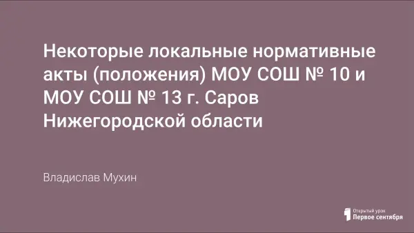 Опубликованы некоторые локальные нормативные акты (положения), которые были написаны в период с 2003 по 2004 гг. Думаем, что коллегам было бы небезынтересно познакомиться с их содержанием. Это положения о школьных предметных олимпиадах, о конференции научного общества учащихся, о дежурстве, о Действиях педагогических работников на случай эвакуации из общеобразовательной школы.