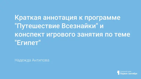Программа направлена на первичное ознакомление детей с историей и географией Земли. Благодаря использованию различных игровых приемов, общей сюжетной линии, смене видов деятельности и положительной эмоциональной атмосфере дошкольник узнаёт о «новой», загадочной стране – Египте.