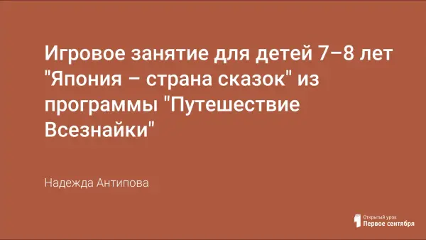 Игровое занятие по программе "Путешествие Всезнайки" . В ходе занятия дети соприкоснутся с удивительным миром Японии: поэзией, традициями и образами, окунутся в неповторимую атмосферу сказки и приключений. Рекомендовано для групповых занятий с детьми младшего школьного возраста.