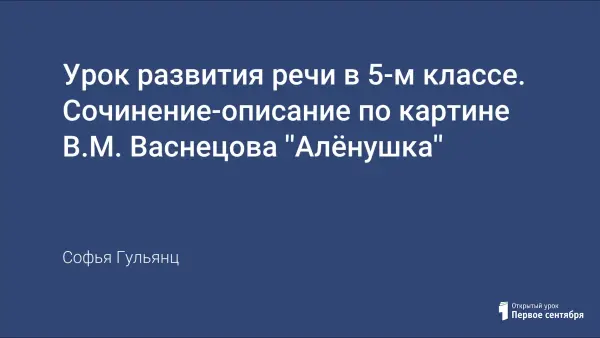 На уроке дети готовятся к сочинению-описанию по картине В.М.Васнецова «Аленушка». Работа на уроке способствует обогащению словарного запаса учащихся, развитию связной речи и творческих способностей учащихся, умению высказывать свое мнение по поводу прочитанного или увиденного.
