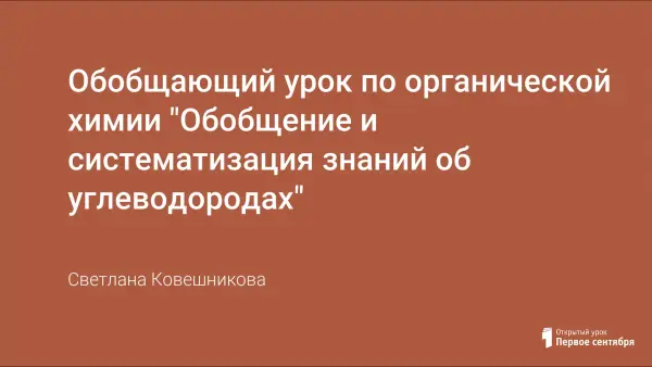 В условиях обучения по новым учебным программам роль уроков обобщения и систематизации знаний учащихся повышается, что требует усиления внимания к совершенствованию их организации. Данный урок обобщения как один из наиболее сложных типов уроков раскрывает структуру и методику проведения занятия. На конкретных примерах показано, как научить в комплексе, применять знания о строении, свойствах и применении изученных органических соединений.
