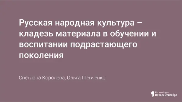 Русская народная культура – богатейший материал для знакомства детей с традициями русского народа, его обычаями, самобытными праздниками, предметами быта. Благодаря энергии прошлого, мудрости, накопленной веками, мы можем стать умнее и лучше, добрее и чище, душевнее и более трепетно относиться друг к другу и ко всему живому вокруг. Приоритетное направление в работе автора – приобщение детей к истокам русской народной культуры в различных видах деятельности.