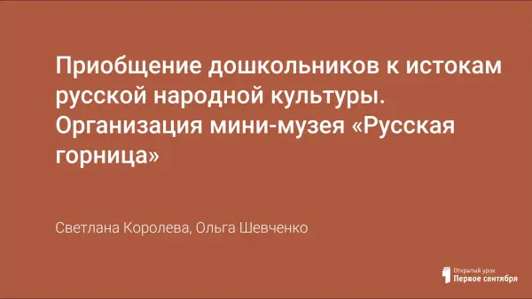 Музейная педагогика является инновационной технологией в сфере личностного воспитания детей, создающая условия погружения личности в специально организованную предметно-пространственную среду. Создание мини-музея «Русская горница» – это действенный, практический способ ознакомления дошкольника с русским бытом, благодатная среда для использования народного фольклора, изучения детьми национальных ремесел и традиций, художественного наследия.