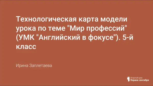 Тема «Работа» изучается в 6 разделе УМК «Spotlight», в который входят микротемы для изучения словообразования по теме «профессии», а также отводится блок для изучения ряда грамматических явлений с Present Continuous. Данный урок - это второй урок в модуле и является уроком развития лексических навыков и формирования ряда грамматических навыков, базируемых на ранее изученных темах. Урок построен в соответствии с программными требованиями ФГОС.