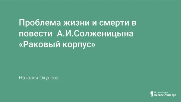 Повесть А.И.Солженицына «Раковый корпус» - о больных онкологического диспансера в среднеазиатском городе (Ташкенте), в том числе ссыльных. О борьбе больных за жизнь, о страхе перед смертью. Автор показывает попытки осмысления жизни и смерти. Общественная обстановка после смерти Сталина, когда страна будто начала обретать сознание после страшной болезни. В героях повести, населяющих одну больничную палату, воплощены боль и надежды России.