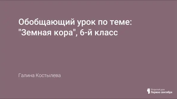 Обобщающий урок по теме: "Земная кора", 6-ой класс. Образовательная и воспитательная цели урока состоят в том, чтобы обеспечить системность и прочность знаний учащихся, внедрить в их сознание наиболее важные мировоззренческие идеи, темы, способствовать дальнейшему развитию разнообразных качеств личности учащихся: трудолюбия, интереса к научным знаниям, любви к родной природе и др.