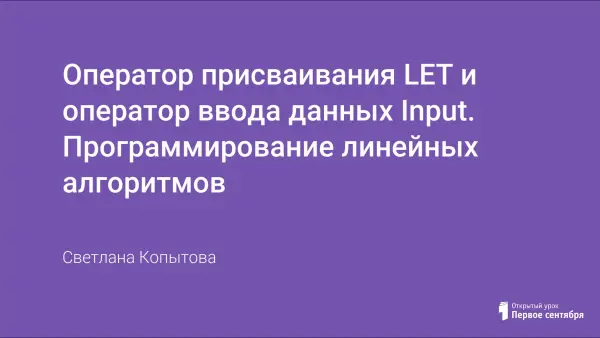 На уроке рассматривается операция присваивания и ввод данных в программировании на языке QBasic в базовом курсе информатики. Урок рассчитан на 2 часа. После него учащие закрепляют знания в лабораторной работе. Если уроки ведутся по одному часу, то на первом часе рассматривается операция присваивания, на втором – ввод данных, а на третьем – лабораторная работа по программированию линейных алгоритмов.