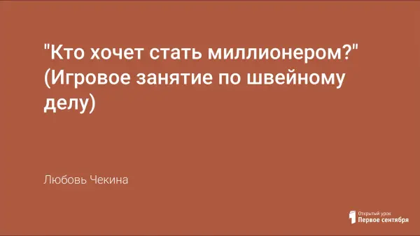 Предлагаю разработку занятия по швейному делу, которое проводилось по сценарию телевизионной игры "Кто хочет стать миллионером?". Игра развивает познавательные и интеллектуальные способности, интерес к предмету, расширяет кругозор учащихся. Игра предлагается для учащихся 7–8-х классов во время предметной недели.