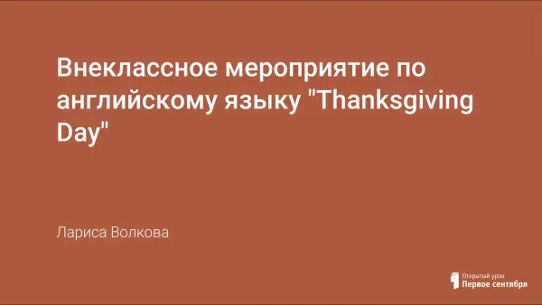 Внеклассное мероприятие по английскому языку “Thanksgiving Day” разработано для учащихся 6-х классов. Целью данного мероприятия является знакомство учащихся с обычаями и традициями страны изучаемого языка, а также развитие межкультурных связей и расширение кругозора учащихся. Для проведения данного мероприятия необходимо изучить дополнительный лексический материал, а также материалы по страноведению.