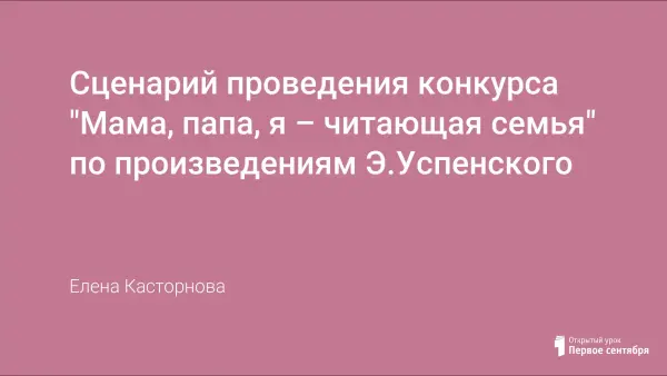 На сегодняшний день нет человека, который бы не знал произведения Э.Успенского. Они учат добру, учат любить людей, радоваться всему, что нас окружает. Кроме того, читаются его книги легко и непринужденно. На уроках внеклассного чтения в 1-м классе четвертой четверти мы с ребятами читаем такие произведения Э. Успенского, как "Дядя Федор, пес и кот", "Крокодил Гена и его друзья", "Вниз по волшебной реке". Конкурс "Мама, папа, я – читающая семья" является заключительным этапом данной работы.