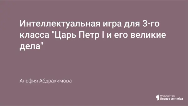 Интеллектуальная игра подготовлена для ребят 3-го класса после прохождения темы «Царь Пётр и его дела» по учебнику Н.И.Ворожейкиной и Н.Ф.Виноградовой «Наша Родина в прошлом». Основной целью игры является знакомство с жизнью, годами правления царя Петра 1 и формирование интереса школьников к исторической литературе. Проведена в форме игры «Умники и умницы».