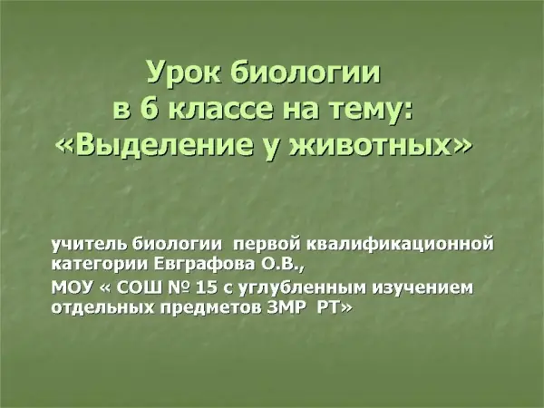На уроке рассматриваются особенности строения и способы выделения продуктов распада у животных. Основная форма работы учащихся групповая. В процессе урока используется презентация педагога, видеофрагменты из CD диска "Биология. 5-9-й класс. Живой организм, часть 2" – "Выделение веществ у амебы"; CD – интерактивное наглядное пособие "Общая биология. Эволюция систем органов".