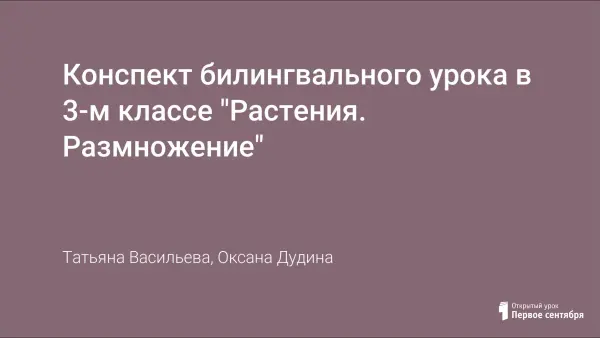 В данном материале представлен план-конспект билингвального урока в 3-м классе по теме «Растения. Размножение». Урок ведут два преподавателя – учителя начальных классов и английского языка. Ценность билингвального обучения в том, что на уроках данного типа язык выступает не как цель обучения, а является средством обучения и получения новых знаний. При системности этих уроков учащиеся понимают, что язык – это средство общения, средство получения знаний. Когнитивные навыки развиваются на более глубинном уровне, идет развитие мышления, а именно: анализ синтез и оценивание информации. Происходит развитие умений слушать, писать и говорить, аргументируя свои мысли на разных языках.