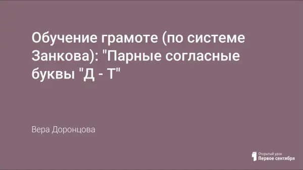 От букваря - в мир отношений, языка, знаний. Тема урока "Парные согласные бук-вы "Д-Т". Цель - достижение оптимального общего развития каждого ребенка - его ин-теллектуальной, эмоционально-волевой активности и нравственных представлений. На уроке решаются задачи успешной адаптации детей к школе и успешного старта в овладе-нии знаниями, умениями, навыками.