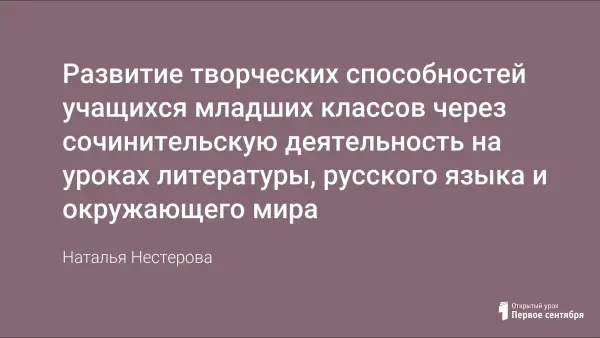 Один из важнейших типов работы по развитию творческий способностей младших школьников на уроках литературы, русского языка и окружающего мира основывается на работе в позиции рассказчик-герой. Сочинения, написанные от первого лица, способствуют умственной активности, быстрой обучаемости, самостоятельности, трудолюбию.